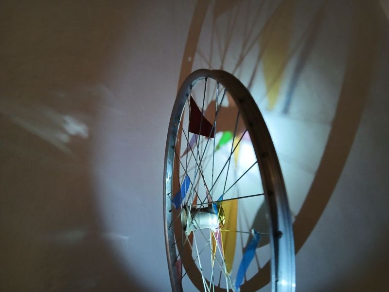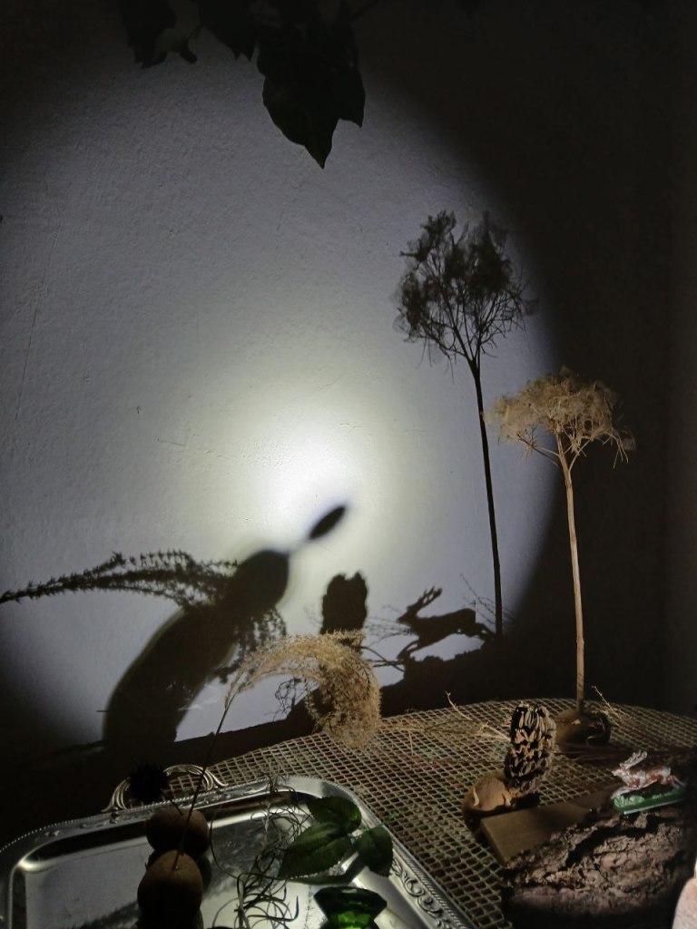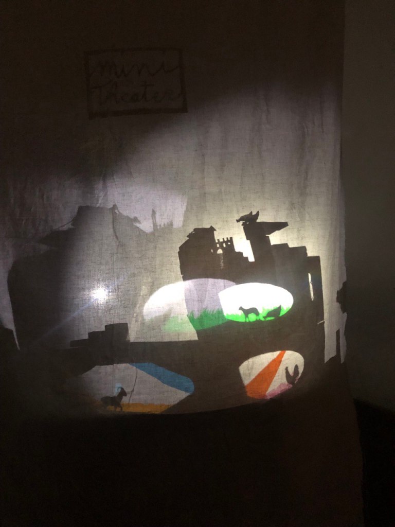 Unser Schattenlabor ist ein Raum gefüllt mit Fundsachen, in dem wir spielen, experimentieren und austesten. Welches Material hat welchen Effekt? Da sind zum Beispiel bunte Flaschen, knorrige Äste, ein alter Regenschirm, ein Rad mit bunten Reflektoren, Federn, Schablonen und viele andere kuriose oder scheinbar ganz normale Gegenstände des Alltags.
